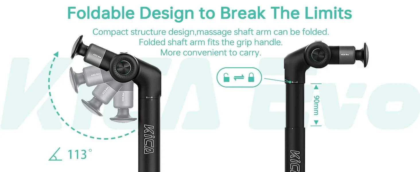 · Adjustable Arm - The Kica Evo Fascial Gun has an L-shaped handle with a Adjustable arm from 0°-113°. 6 adjustable angles allow you to hit sore areas with precision.